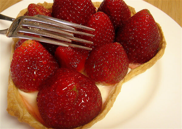 把奶油奶酪馅和分裂两个蛋挞。与草莓和小雨糖浆。一层细砂糖融化是一个很好的联系但不必要的。享受吧!