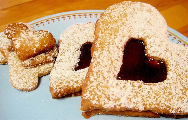 当饼干完全冷却,果酱传播到每个固体心形饼干的中心。不传播到饼干的优势在果酱将被迫离开。使用细网状过滤器充满了¼杯糖果的糖(开始),轻尘open-centered饼干。根据需要添加更多的糖过滤器。