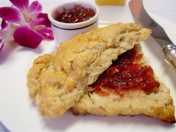 在一个中型或大型的搅拌碗中,将面粉、糖、泡打粉、小苏打和盐搅拌在一起。加入杏仁,搅拌均匀。在一个小碗里,将酪乳和香草搅拌均匀。把冷黄油切进面粉混合物中,搅拌均匀。将酪乳混合物加入面粉混合物中,搅拌均匀。在碗里轻轻揉面团,直到完全混合。但是要注意,不要搅拌和揉得太多——你只是想把材料混合在一起。如果你必须再加一汤匙酪乳,那就这样做,否则就把混合物轻轻打成一个球,然后把面团放在工作台上。
