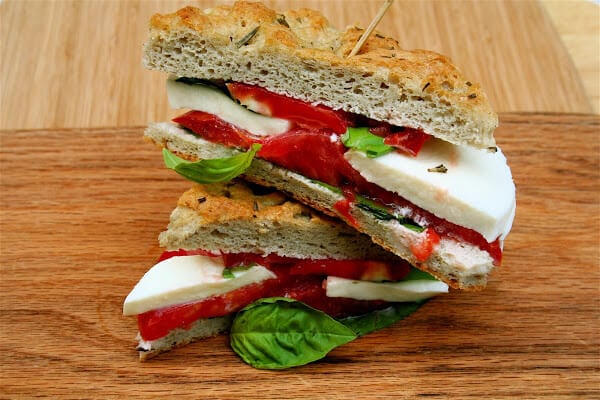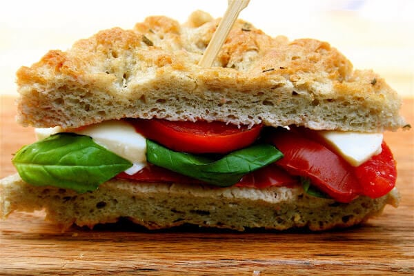 烤15分钟,旋转烤盘,再烤10到15分钟,直到佛卡夏面包呈金黄色。从烤箱中取出,将面包从锅中转移到冷却架上。完全冷却后再切片,用来做三明治。