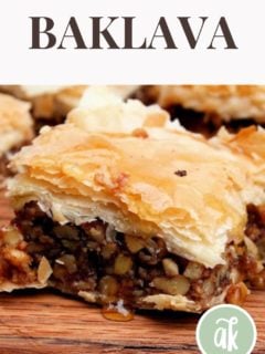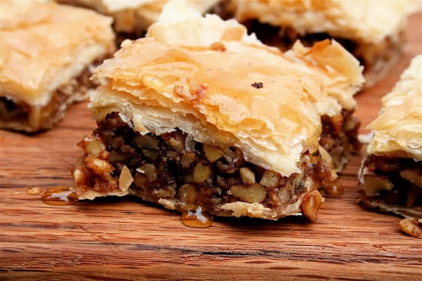 刷fillo顶层的黄油。使用锋利的刀,分数的果仁蜜饼钻石模式。把锅放在烤箱,烤30到45分钟,或者直到金。删除从烤箱,立即把蜂蜜倒在上面。