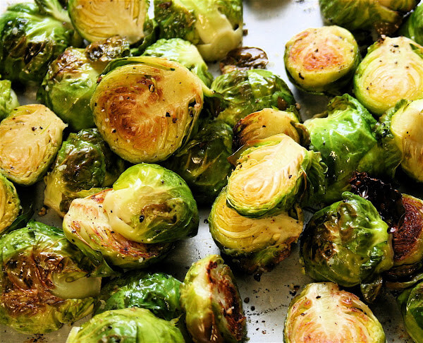 烤箱预热到400ºF。切断了每个球芽甘蓝和丢弃。将每个发芽减少一半。在有框的烤盘。细雨2 - 3汤匙的橄榄油。撒上调味用盐和胡椒调味。搅拌直到均匀涂上香料混合在一起。烤15到20分钟或直到豆芽刀温柔,有点烧焦的。