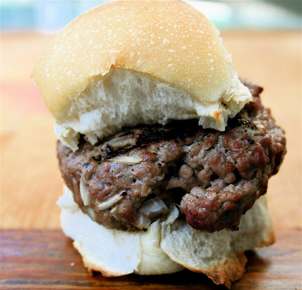 1。把肉在一个大碗里如上图所示。均匀洒上粗盐。撒上洋葱。形成馅饼5到6盎司每个。冷藏,直到准备做饭。