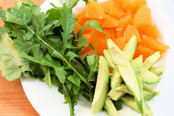 2。同时,准备沙拉:将芝麻菜在一个大碗里装满了冷水浸泡。剥桔子,除去部分髓(如果需要的话)。片鳄梨的一半;把坑;挖出肉;和切成条状或切成方块。备用。