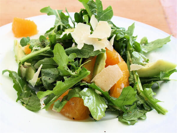 4所示。排水芝麻菜和自旋干。把芝麻菜放在一个碗里。橙子和鳄梨。加酱调味。轻轻地搅拌。板块之间的分歧。上面每一个沙拉盘几刨花的实情。