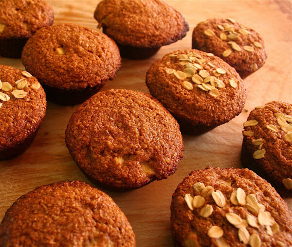 2。把麦麸、燕麦麸、全麦面粉、苏打粉、泡打粉和盐在一个大碗里,备用。把鸡蛋,牛奶,酸奶,菜籽油,糖浆,蜂蜜在一个小碗里,拌匀。湿成分倒入干成分和混合橡胶抹刀只是之前的总和。加入切碎的苹果。