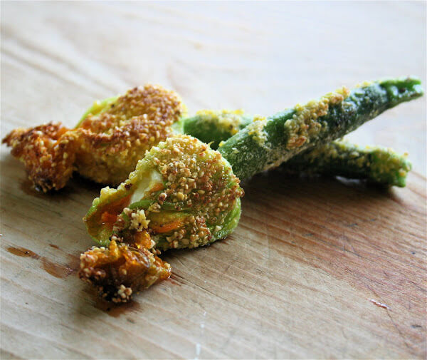 准备我认为最好的方式是这样的:买一些山羊奶酪。如果你喜欢它,用盐,胡椒粉,一些草药,青葱,等等。如果你不,不——普通山羊奶酪就可以了。放置一个小——小山羊奶酪里面每一个。不要对物…它不使他们更好。捏花关闭。少量的牛奶或脱脂乳在浅船。少量的玉米粉在另一个浅的容器。热一个不沾锅中火。加入的混合油和黄油。 Meanwhile, dip each blossom in milk and then in cornmeal. When the butter begins sizzling, add the blossoms to the pan. Let them cook until golden brown. Remove and serve with anything.Yum.