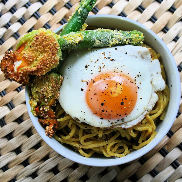 Well I’ll be your facebook friend! What’s really funny about this, is that my husband is always saying everything’s better with an egg on top – it’s sort of become part of his schtick. The fried zucchini blossoms look awewome, btw.