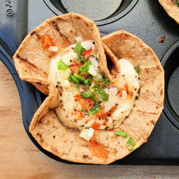 3所示。去掉箔和加2汤匙炸豆泥玉米玉米杯,压成杯的底部。做一个压痕中心的炸豆泥和精心裂纹鸡蛋到每个缩进。每个鸡蛋有一撮盐和胡椒调味。前各有一撮奶酪和飞溅的塔巴斯科(如果需要的话)。在烤箱烤,直到白人只是集合,大约15分钟。