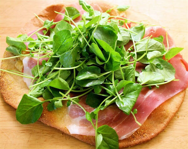 5。把豆瓣菜与柠檬汁、橄榄油和大蒜在一个中等大小的碗里。前豆瓣菜中,洒上胡椒的披萨。切成楔形和服务。
