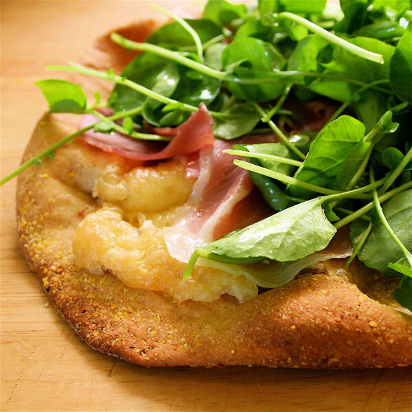 4所示。把披萨面团轻轻磨碎的表面上一个12英寸的圆的。将面团准备表。把布里干酪均匀的面团。烤披萨,直到布里干酪融化和地壳底部金黄,大约15分钟。把披萨切肉板。将火腿均匀的披萨。