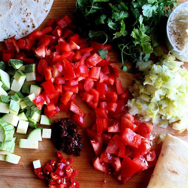 总之,上周末,我从冰冷的命运中拯救了四个玉米饼。当我在冰箱里发现它们时,我想起了我在蓝鹭农场(Blue Heron Farm)网站上看到的一个芦笋乳蛋饼食谱,用玉米饼做壳。然后我玩了一个游戏叫“用尽你冰箱里所有可能sautéed的食物,把它们装进蛋饼壳里。”不会玩?试一试。这是一段美好的时光。这款游戏最有趣的地方在于它没有任何规则:过期日期可以忽略不计;模具,刮除后送下处置;干瘪、枯萎的蔬菜,擦洗、切碎,就像它们是新的一样。