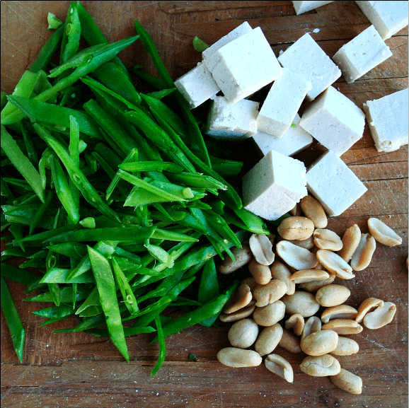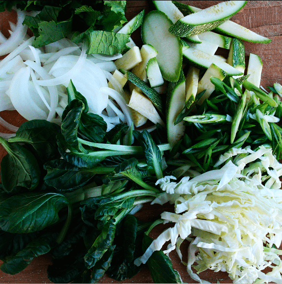- 把所有的食材都切碎。在所有蔬菜都准备好后,炒菜需要五分钟,所以最好提前把所有的蔬菜都切碎。这是我使用的:洋葱,卷心菜,小白菜,莴苣,香菜,雪豆,西葫芦,大葱,豆腐而且花生.一定要把白菜洗干净。