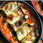- 预热烤箱至425ºF。将番茄酱(大约3/4杯)舀入一个9英寸的圆形烤盘或类似大小的容器中,直到盘子底部覆盖上一层薄薄的番茄酱。在每片茄子的一端放一勺(约2茶匙)馅料。把切片卷在馅料周围,把它缝边朝下放在盘子里的番茄酱上面。在面包卷上淋上或刷上奶油使其湿润。或者,在顶部刷上橄榄油。烤25到30分钟,直到盘子周围的酱汁边缘变黑,面包卷也很好地焦糖化。上桌前在上面刮一层帕尔马干酪。
