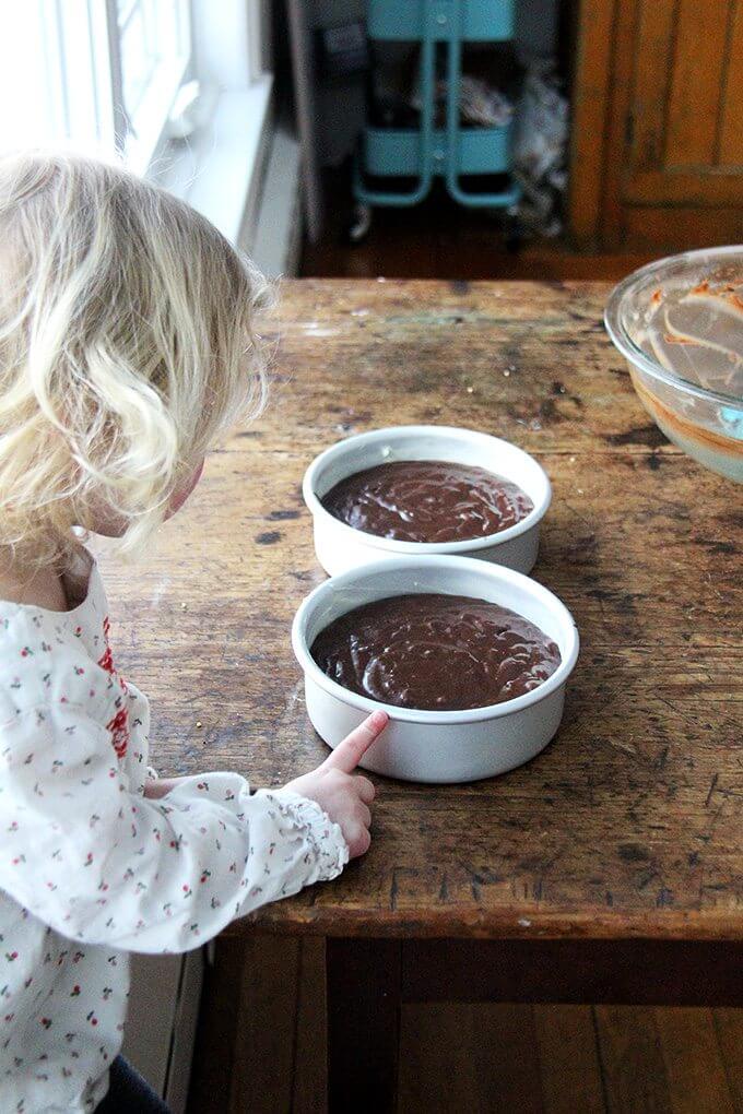 把食谱减半后,蛋糕的大小仍然相当不错——我为本和我做了一个双层蛋糕,上面有巧克力甘纳许,为孩子们做了一个双层蛋糕,上面有巧克力奶油糖霜。这一次的剩菜已经可以吃了,尽管我还是发现自己早晚都在偷偷吃。下次,四分之一的食谱,我会随时通知你的。