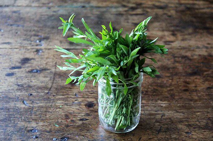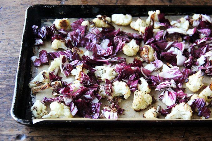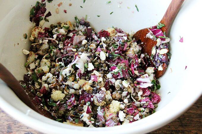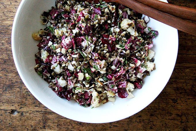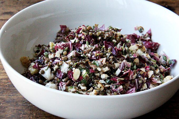 从这篇文章的标题可以看出,这款沙拉是由烤蔬菜、扁豆、核桃和山羊奶酪混合而成的。但是,除了标题所揭示的内容,还有更多的内容。除了烤过的菊苣,还有很多新鲜的龙蒿,所有这些都用切碎的凤尾鱼、青葱、芥末、蜂蜜和红醋栗做成了一种尖锐、甜、咸的酱汁。整个组合太棒了。我发现,当小扁豆还略温的时候,新鲜做的小扁豆就像半天之后——迄今为止最长的时间——早上10点直接从冰箱里拿出来,当我第一次发现自己在吃剩菜的时候一样令人满意。真的,我一觉醒来就梦到这沙拉了。
