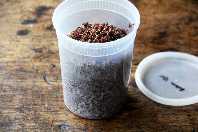 这个食谱的关键,对于早晨的谷物来说似乎有点繁琐,但我保证它是值得的!-是提前煮藜麦。把它藏在一夸脱的容器(这是你拥有的最方便的存储容器),你可以把它放在身边,搅拌到早上的燕麦或晚上的沙拉中。