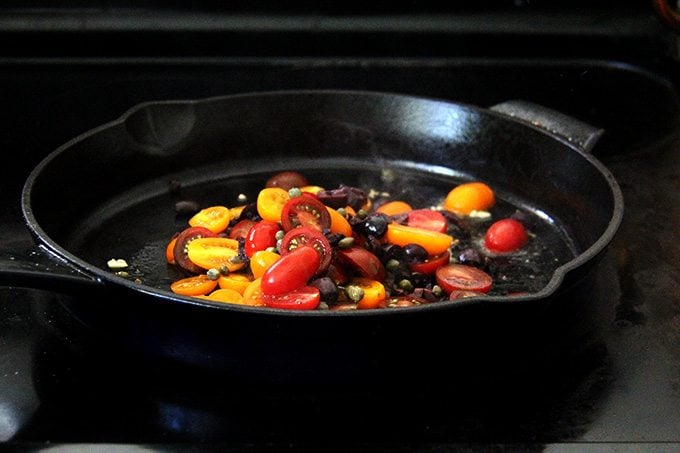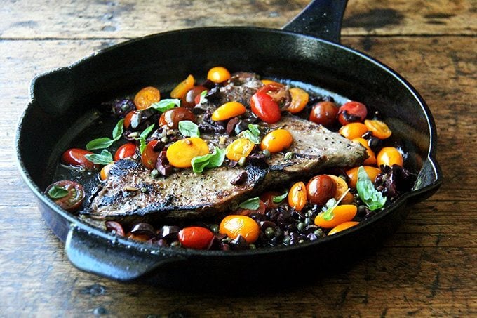 在这里,而裙子牛排休息,你会做一个简单的酱尼斯。樱桃番茄减半后,粗切橄榄,扔两个酸豆,你会短暂地炒混合橄榄油和大蒜。几分钟后,番茄会开始分解,释放出果汁和脱硫软化。鲜榨柠檬汁在最后提供了一个欢迎的酸度。