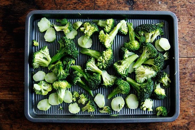 - 准备西兰花:修剪和西兰花切成小花。不要丢弃茎(因为它们很好!):艰难的外皮和结皮,然后把茎切成切成1/2英寸轮。细雨1汤匙油光秃秃的平底锅,漩涡的外套,散射的西兰花,细雨与另一汤匙的油,慷慨地用盐和胡椒调味,把外套用手。甚至蔓延到一个层。