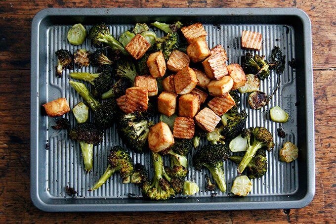 - 煮豆腐和西兰花:把两个表锅放进烤箱,烤20分钟,然后把周围的碎片甚至着色和烤10分钟。在这一点上,通常做豆腐,也就是说金色的边缘和轻脆的。把锅从烤箱。如果有必要,烤10分钟的西兰花获得额外字符。