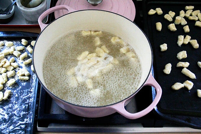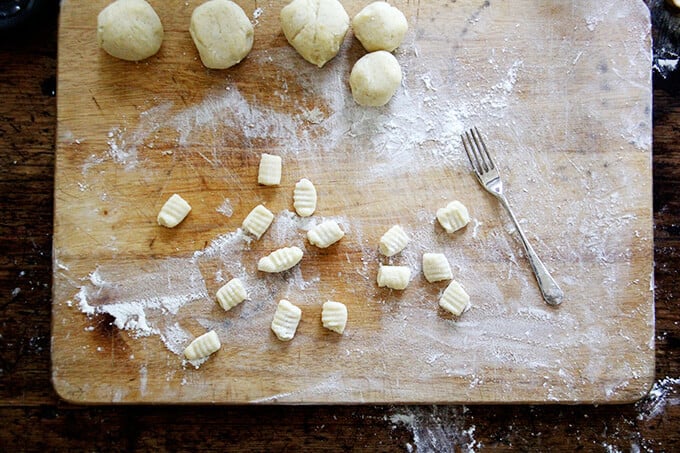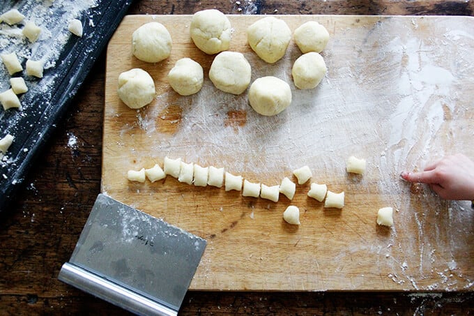- 融化两汤匙黄油。在一个小碗里,将融化的黄油、鸡蛋、2汤匙帕尔马干酪和盐搅拌在一起。淋在热土豆上,然后撒上3/4杯面粉。用指尖轻轻将混合物揉成球状。面团应该柔软但不粘;如果黏糊糊的,就把剩下的面粉一勺一勺地加进去。将面团揉成圆盘状,切成1英寸的薄片。把每一片都卷成球。