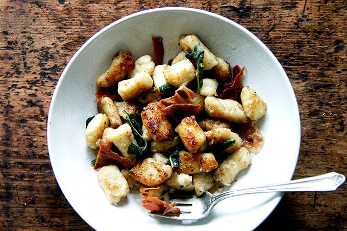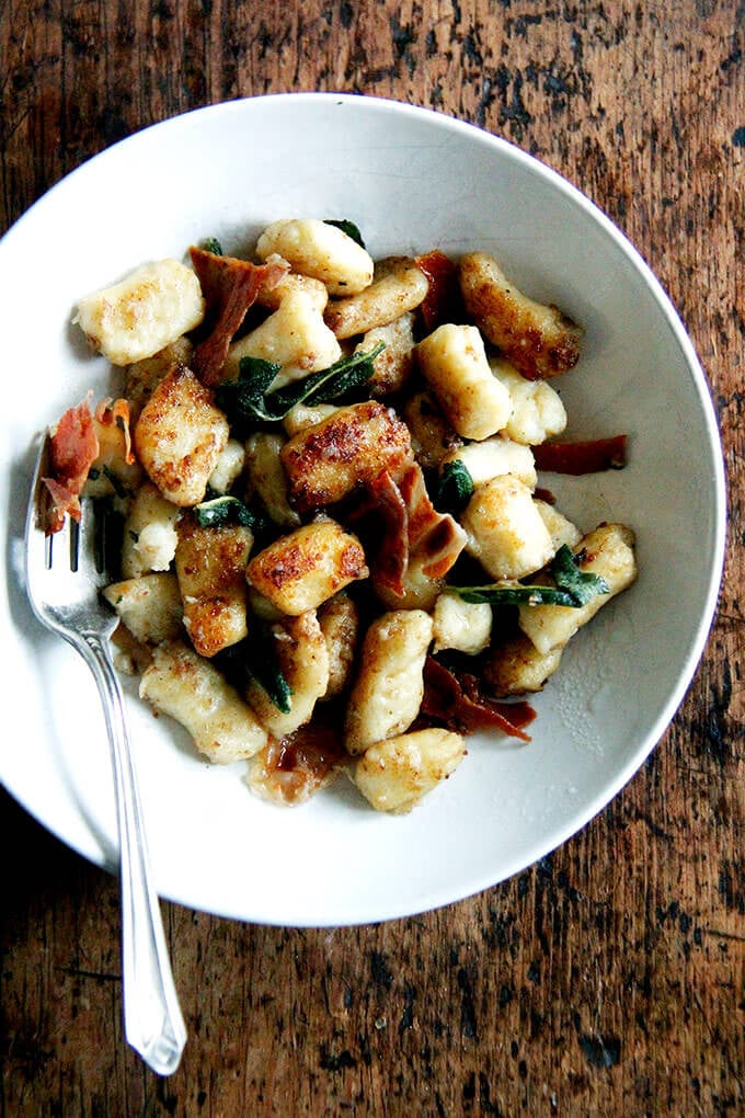 土豆汤圆配棕黄油,脆皮熏火腿和鼠尾草,来自Jessica Battilana的曲目