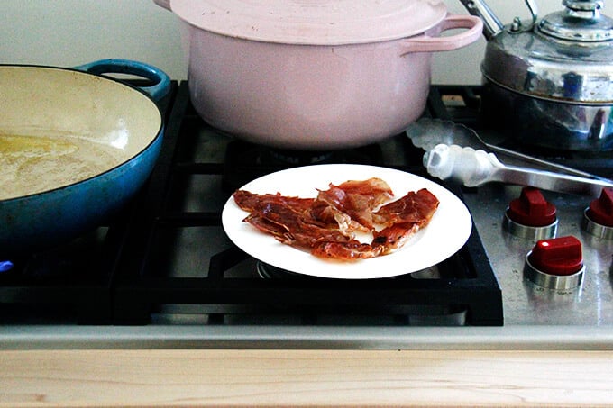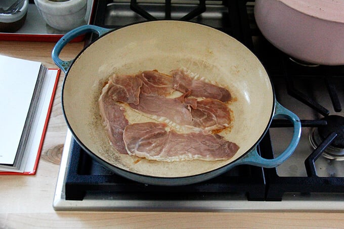 - 用中火加热一个大的不粘锅。把几片熏火腿放在平底锅里,单层地煮,翻一次面,直到酥脆,大约2分钟。将烤好的火腿移到盘子里,重复这一步骤,直到所有的火腿都煎熟。在锅里加入剩下的4汤匙黄油,融化后,加入鼠尾草叶,煎至酥脆。把炸好的鼠尾草和熏火腿一起放到盘子里。