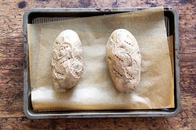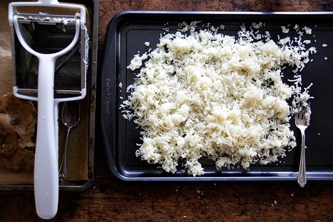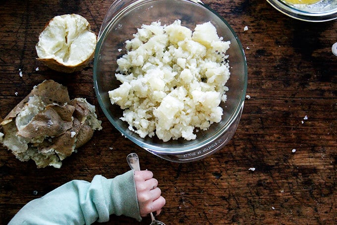 - 预热烤箱至400华氏度。把土豆洗净,放在带边的烤盘上。用叉子在每个土豆上戳 个洞。烤至变软,大约1小时。从烤箱里拿出来,冷却到可以拿,但仍然很热的时候,把土豆分成两半,挖出果肉。去皮。把土豆肉通过碾米器放在带边的烤盘上,均匀地铺成一层。