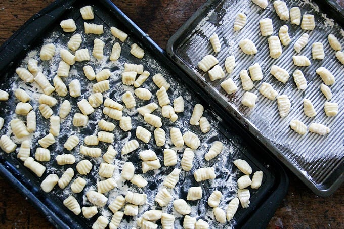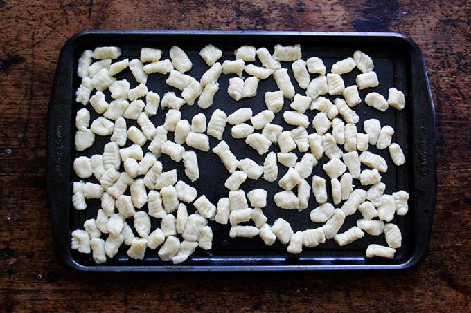 - 在带边的烤盘上撒上面粉,放在旁边。在一个撒了少量面粉的工作台上,一次用一个面团团,擀成大约3/4英寸的蛇形。把每条蛇横切成3/4英寸的小块。用你的拇指一次揉一张面团,把每一张面团在汤团耙上或翻倒的叉子尖上滚动,轻轻压下,让汤团在你的拇指周围略微弯曲,然后掉在准备好的烤盘上。重复上述步骤,直至所有汤圆成型。(你可以把汤圆做到这个程度,在烤盘上冷冻,然后把它们转移到塑料冷冻袋中。它们可以从冷冻中煮沸。)