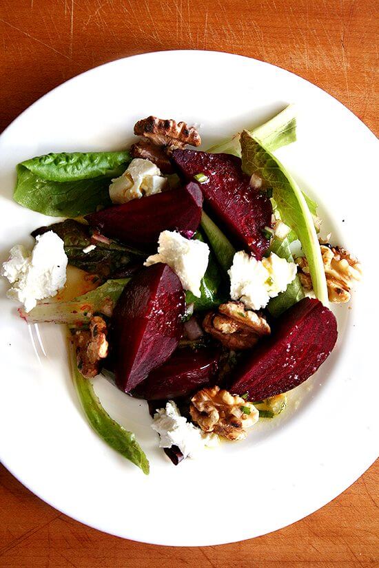 一个经典的组合,一个老最喜欢的:壳甜菜、山羊奶酪、核桃、新鲜橙醋: