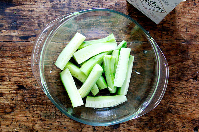 - 黄瓜:去皮(如果你愿意),切成矛,盐(片状的东西莫尔登在这里很好),然后把它们放进冰箱里,直到你准备好了。清爽可口。孩子们通常也喜欢它们。