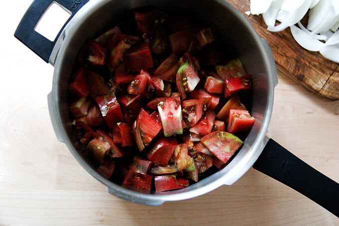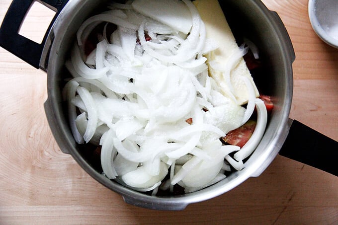- 把西红柿、洋葱、粗盐和黄油放入高压锅中。盖上盖子。把火调到最高。当可以看到阀门上的两条红线时,把火调小——阀门应该下降到只露出一条线——煮5分钟。关掉暖气。让阀门自然释放,这应该需要15-20分钟。