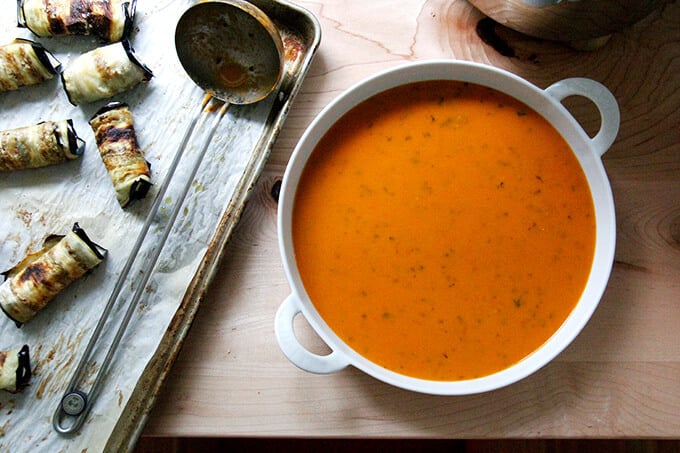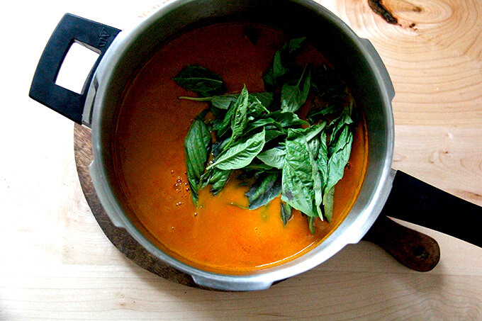 - 移除盖子。Purée,如果用的话,加入罗勒,直到光滑——我用的是浸入式搅拌机;如果你没有,可以使用传统的搅拌器或食品加工机。酱汁会很稀。把锅放回燃烧器上,用小火或中火炖至酱汁达到所需的稠度。注意:记住,当你在茄子茄子或茄子帕尔马干酪中使用酱汁时,它会在烹饪过程中进一步减少。我越来越多地保持酱汁的稀度,并根据需要减薄。此外,这个食谱可以很容易地变成汤,只需把它煮到想要的稠度,再加一点奶油。