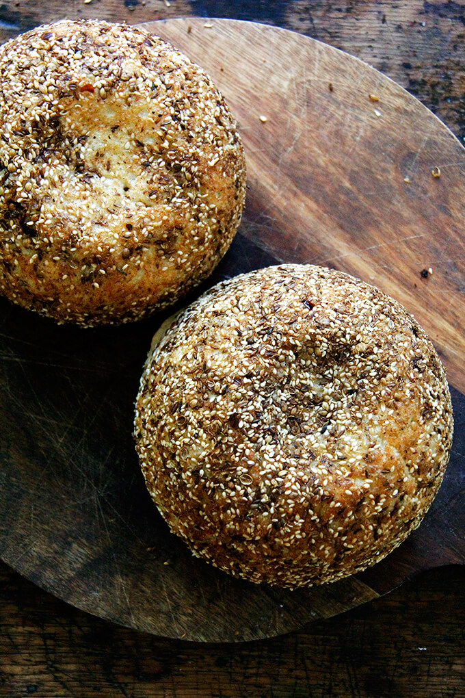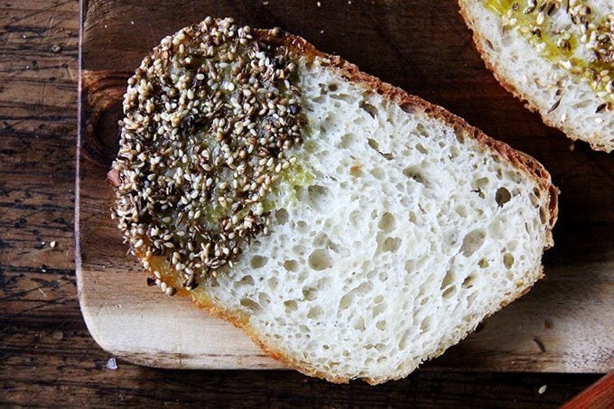 如果你做农民面包,你也可以在你涂了黄油的耐热玻璃碗里面涂上杜克卡,把面团撒在上面,像往常一样烤面包,这样你就得到了两个漂亮的dukkah涂层的面包。