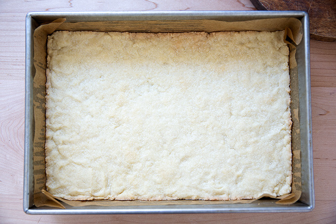 - 使地壳:倒入面粉,盐和糖放在碗里的食物处理器。把黄油切成块,并将它添加到碗里,然后运行机器,直到混合物形成大团块是正确的,就坚持跑步;可能需要另一个30秒走到一起,但它会。面团块转移到准备好的烤盘,压在底部均匀和1/4英寸的。烤了15到20分钟,直到非常淡金色。