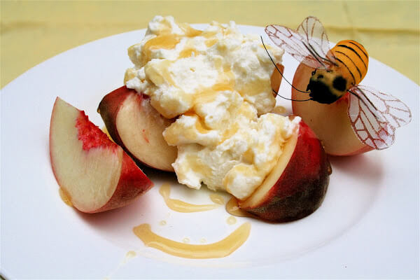 这道菜不能简单的准备:片桃子,前几勺新鲜的意大利乳清干酪和小雨整个混合蜂蜜调味。这种组合使一个精美的甜点,但可以享受真正在一天中的任何时间:早餐,午餐,丰盛的小吃吗?