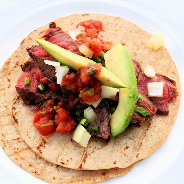 1。预热烤箱到高。(另外,放置一个大煎锅在高温和添加一汤匙橄榄油。)赛季的牛排各方用盐和胡椒粉调味。烤箱预热到300ºF。包装箔的玉米饼和烤箱。
