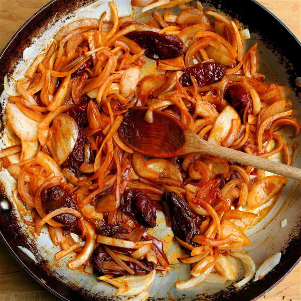 - 在一个中型汤锅添加石油和中火的地方。中火炒洋葱,直到略焦糖,大约5分钟。辣椒加3和1汤匙酱油的小罐辣椒(或者,如果你喜欢香料,加上整个可以像我一样)。