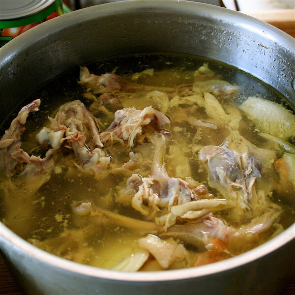 - 将鸡肉、鸡骨头放入大锅,加入剩余的成分。封面用冷水。煮至沸腾,然后关掉暖气的,水是慢慢酝酿。勺,丢弃任何气泡在表面的浮渣。让轻轻煮约2小时。