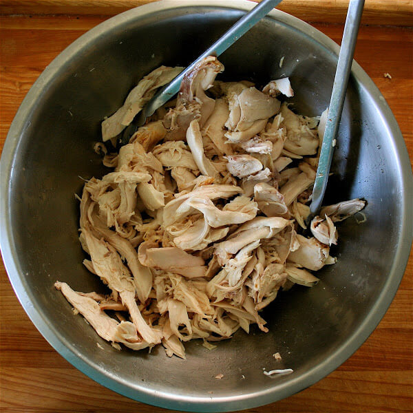 - 把鸡肉放在一个大锅,封面用冷水。煮沸,减少只是用文火热的水烧开,煮45分钟。关掉火,鸡转移到一个大碗里冷却。当鸡完全冷却,把肉从皮肤和骨骼,在一个干净的碗。(骨骼和皮肤在一锅,加满水,煮,不要让几个小时。应变和股票转移到塑料存储容器。冷藏过夜。第二天,刮掉的脂肪和丢弃。冻结库存)。