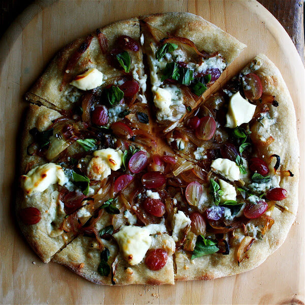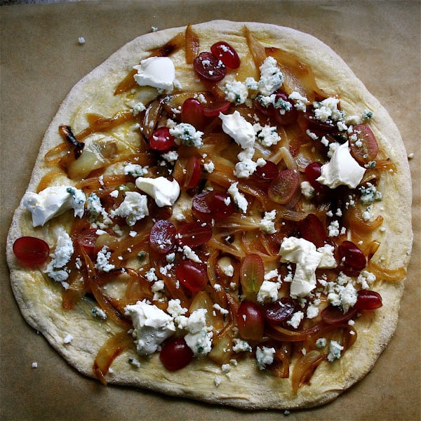 我解决了。我决定不再做匹萨面团的另一个秘诀。认真对待。这是它。我的家人多年来一直做这道菜,它非常美味。尝试和真正的。万无一失。没有必要调整。焦糖洋葱,葡萄(或无花果),戈尔根朱勒干酪和mascapone(或其他一些奶油奶酪像意大利乳清干酪)是我们的一个最喜欢的组合。