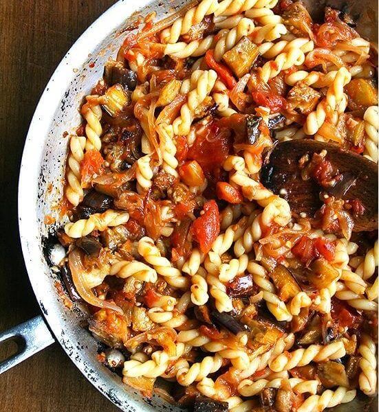 - 同时,热量大煎锅,中火2汤匙橄榄油和洋葱。用盐和介质中低火炒至洋葱是焦糖,20分钟到25分钟。加入大蒜和碎红辣椒片,煮30秒;然后用雪利酒醋使脱釉。加入番茄酱和茄子。热酱汁煨。排水的意大利面,将其添加到西红柿酱锅,轻轻地搅拌。味道。调整用盐和胡椒调味。