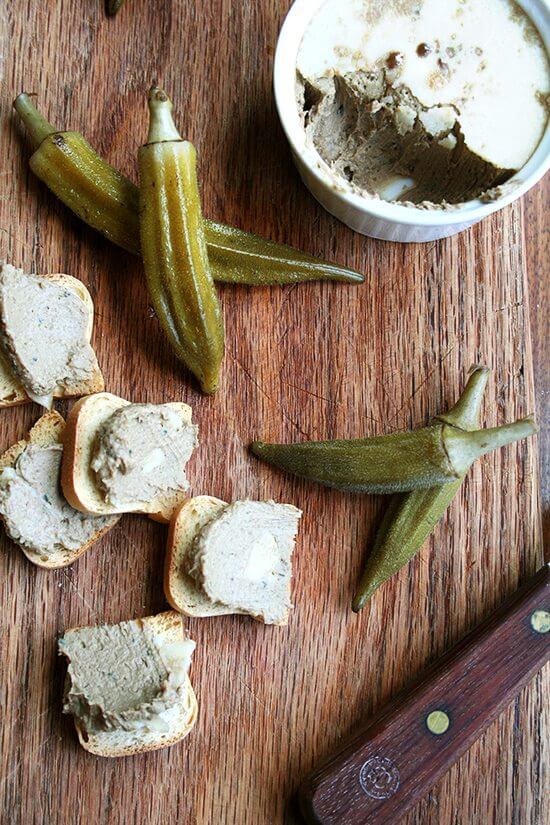与泡菜秋葵,我认为它只适合做一些馅饼。我使用的秘诀来自乍得罗伯特“贝克的鹅”Tartine面包用鸡肝、青葱、百里香、白兰地和黄油。罗伯逊指出,他设计了这“快速和美味的食谱”来满足他脑袋的欲望,“味道好像你比你花了更多的时间和资源。“这是事实——这脑袋是简单的准备,我无法想象一个品尝更好,特别是对于付出努力。白兰地的一层黄油,外表当然不会伤害。快速的假期临近,这可能是一个很好的一个给一个旋转。