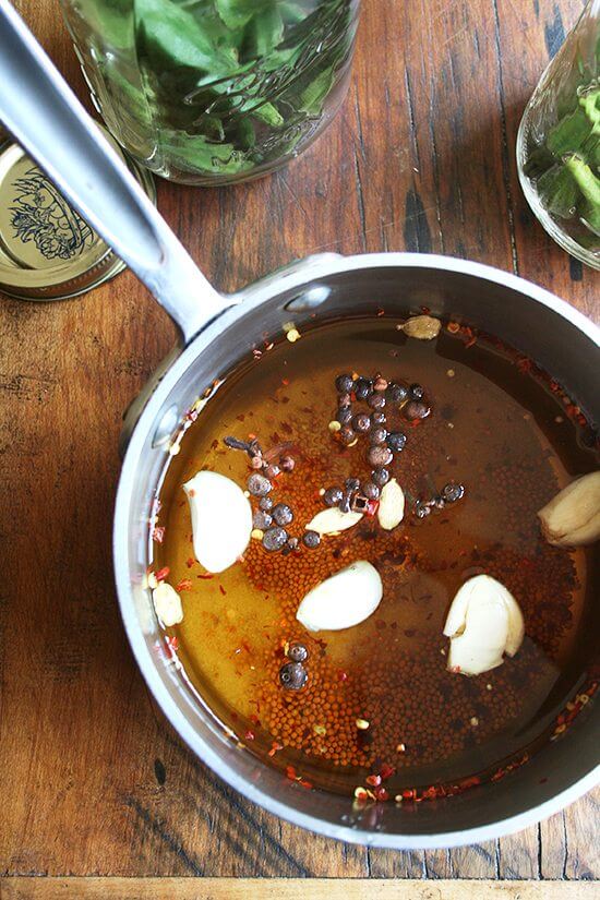 - 与秋葵紧密包装瓶,然后把1大蒜丁香每个jar。把剩余的成分煮沸2夸脱深不反应的平底锅,搅拌直到糖和盐溶解。浸渍液均匀地分配给坛子。
