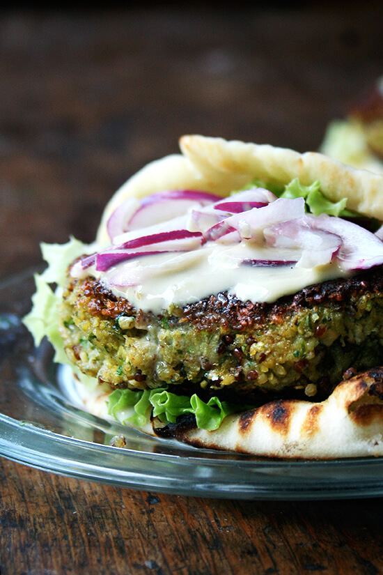 不吃肉吗?这些蔬菜汉堡制作沙拉三明治风格与浸泡(不熟!)鹰嘴豆,煮熟的奎奴亚藜和磨碎的西葫芦。服务与芝麻酱。