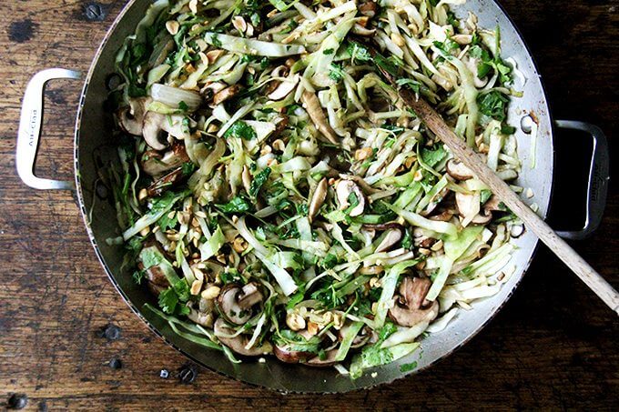 辣椒现在的季节,我一直用香菇,其肉的质地和森林的味道很好地补充卷心菜,我想其他一些vegetables-julienned胡萝卜,碎球芽甘蓝和花椰菜,可能也被使用。代替传统的炒蛋,我似乎从来没有得到正确的纹理,我已经烤豆腐块儿,穿着简单用酱油和油,和折叠的。
