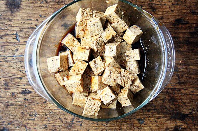 - 114盎司块extra-firm豆腐,拍了拍干,切成1英寸立方体