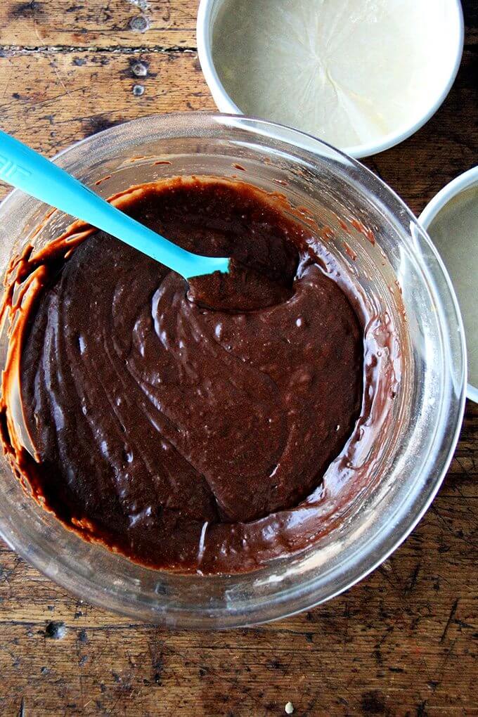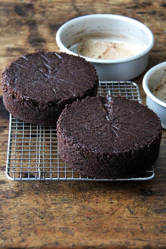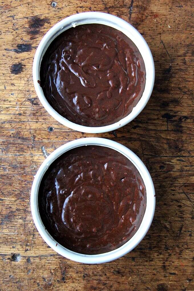 这是我最喜欢的巧克力蛋糕,它确实是一个经典,击败其他所有人(我已经取得了许多)。如果有人选择完整的配方,我发现它符合三个9英寸x 2英寸的平底锅。如果你去蛋糕的路线,知道这道菜不产生漂亮的圆顶顶部,这些会更flat-toppish。最后,这是一个伟大的基础以石油为原料的冰淇淋蛋糕,因为蛋糕有更好的纹理比奶油冻。