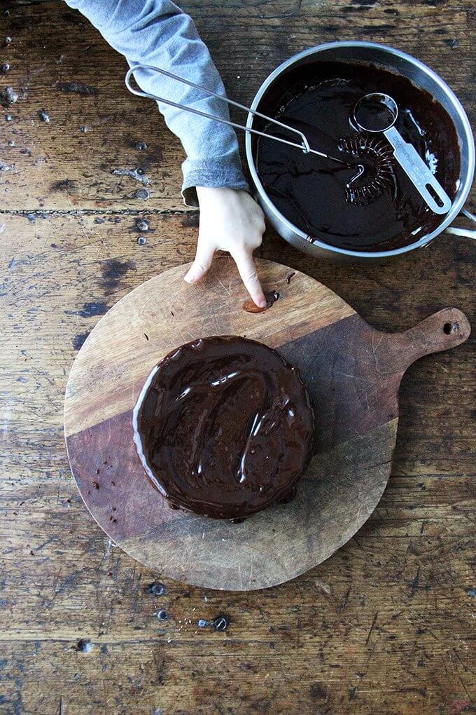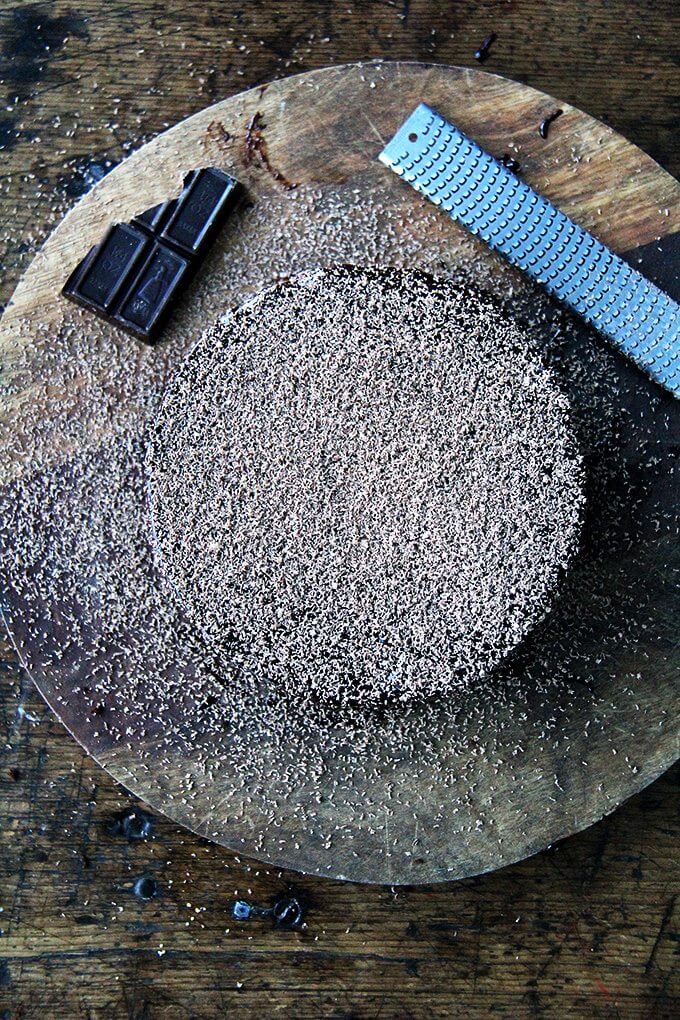 - 如果你正在一层蛋糕,薄薄的一层巧克力酱的蛋糕层之一。(注意:如果你烤一个层,用锯齿刀横向赤字减半,并传播巧克力酱在上面一层。)与其他蛋糕层顶层。顶层的倒上巧克力酱,抵消抹刀,传播的。如果需要,广场的巧克力在磨泥刨丝器或剃削皮器直到蛋糕的顶部覆盖着巧克力削片。蛋糕保持覆盖和冷冻3天。之前带蛋糕到室温。(我一直在室温下总是…冰箱里没有空间。)