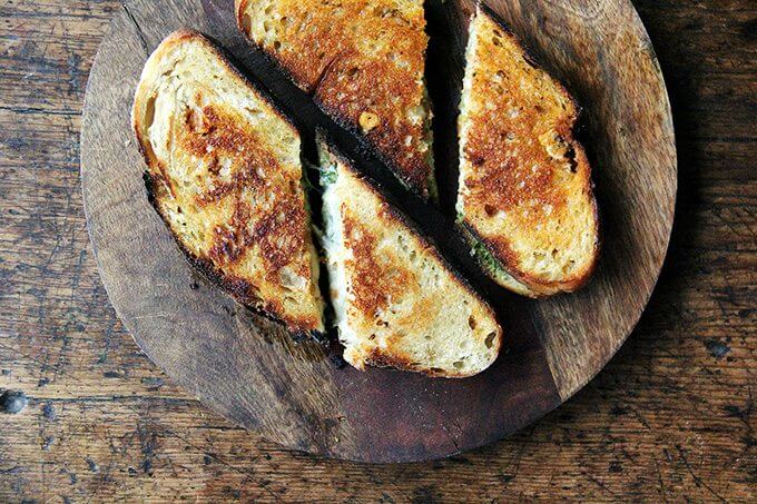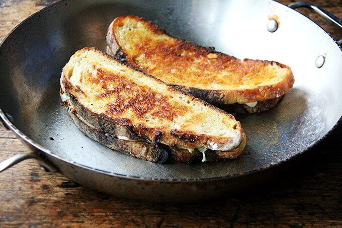 - 两边煎,直到奶酪融化和面包是烤金,2到4分钟。我喜欢压低三明治与另一个锅(像一个沉重的锅)第一只。把三明治从热量。让冷却1分钟,然后切服务。